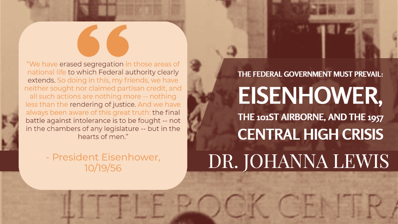 Guest speaker, Dr. Johanna Lewis will join us virtually to continue our discussion around the Little Rock School Integration Crisis. Our recent program "Difficult Decisions: The Little Rock 9" examined the situation from the perspective of the nine students involved. Lewis will help us explore the use of military force to manage the situation. In the Fall of 1957, Arkansas Governor Orval Faubus ignored the 1954 U.S. Supreme Court decision Brown v. The Topeka Board of Education and sent in the Arkansas National Guard to prevent the nine African American teenagers from attending Little Rock's Central High School. President Eisenhower was clear from the outset that the federal government would support the Constitution and the Supreme Court. Eisenhower responded by calling in the 101st Airborne to escort the students into the school on September 25, 1957. Dr. Lewis is Associate Dean for Curriculum and Student Success in the College of Humanities, Arts, Social Sciences, and Education, and professor of History at the University of Arkansas at Little Rock. She holds a Ph.D. from the College of William and Mary. Dr. Lewis has a book, Artisans in the North Carolina Backcountry, a documentary Time of Fear, and numerous articles, presentations, and exhibits to her credit.