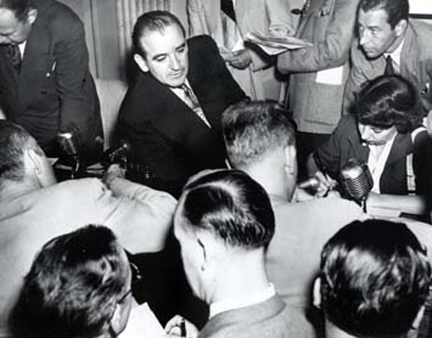 Senator Joseph R. McCarthy was a little-known junior senator from Wisconsin until February 1950 when he claimed to possess a list of 205 card-carrying Communists employed in the U.S. Department of State. From that moment Senator McCarthy became a tireless crusader against Communism in the early 1950s, a period that has been commonly referred to as the "Red Scare." As chairman of the Senate Permanent Investigation Subcommittee, Senator McCarthy conducted hearings on communist subversion in America and investigated alleged communist infiltration of the Armed Forces. His subsequent exile from politics coincided with a conversion of his name into a modern English noun "McCarthyism," or adjective, "McCarthy tactics," when describing similar witch hunts in recent American history. [The American Heritage Dictionary gives the definition of McCarthyism as: 1. The political practice of publicizing accusations of disloyalty or subversion with insufficient regard to evidence; and 2. The use of methods of investigation and accusation regarded as unfair, in order to suppress opposition.] Senator McCarthy was censured by the U.S. Senate on December 2, 1954 and died May 2, 1957.